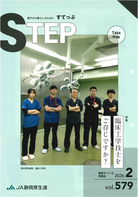 静岡県厚生連 広報誌「すてっぷ2026年2月号」を掲載しました 2026 2/02 静岡県厚生連 広報誌「すてっぷ2026年2月号」を掲載しました 特集 臨床工学士をご存知ですか? おうち de 体操「有酸素運動が脳に及ぼす影響」 病院に聞いてみました「発達障害」 News & Topics 清水厚生病院院内保健講座開催のお知らせ他 健康食彩レシピ「豆腐とお麩の味噌グラタン」 すてっぷ2026年2月号№579はこちらから→ 病院情報・広報関係・年報 → トピックス
